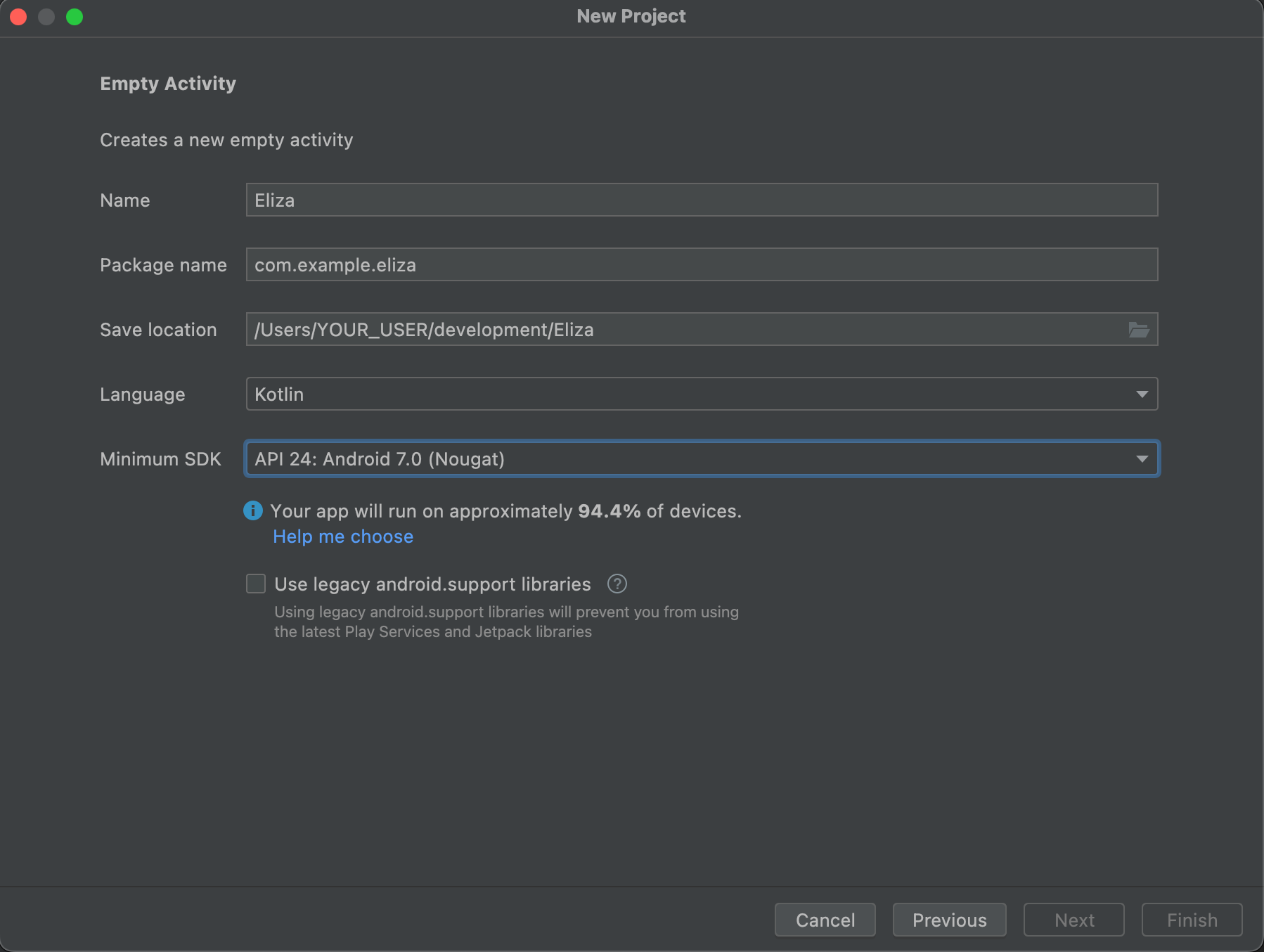 2. Make sure the package is com.example.eliza, and leave the rest as default.